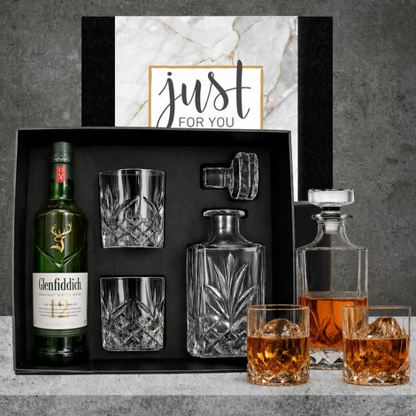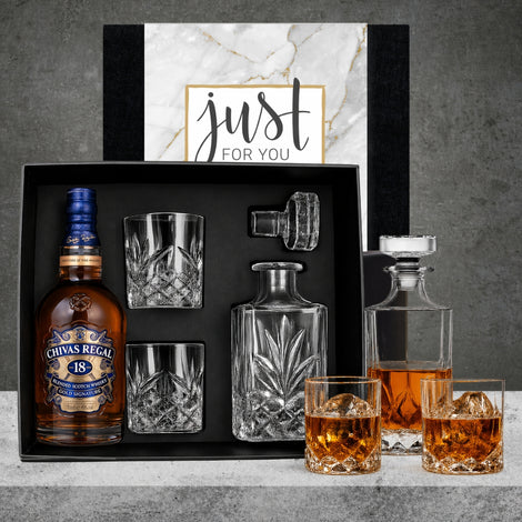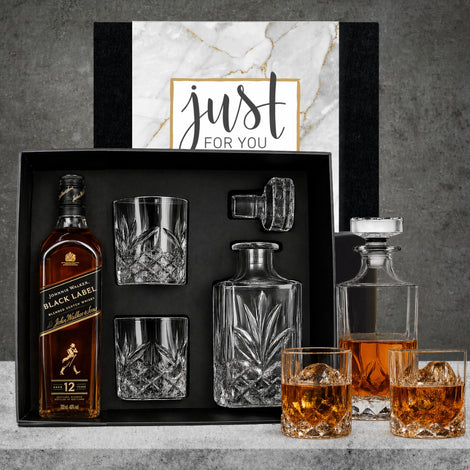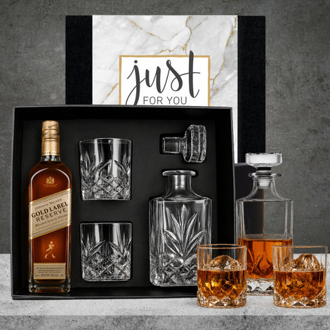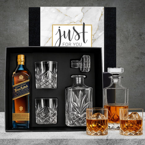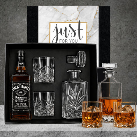 A deluxe whisky and decanter gift set, presented in a stunning gift box. This wonderful gift hamper with the Master of Whiskies, Johnnie Walker, Chivas & Jack Daniels makes an exquisite Christmas gift, Birthday present, Anniversary or Valentine's gift of love, or a perfect thank you gift for the whisky lover.