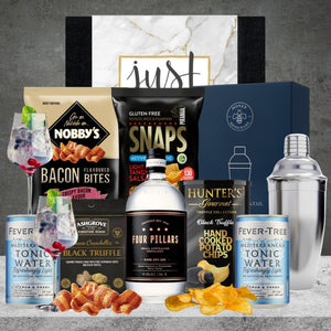 Sit back, relax and enjoy a gin & tonic with Four Pillars Rare Dry Gin. This gift includes a variety of snacks to enjoy that mix sweet with savoury. This gift is sure to impress.