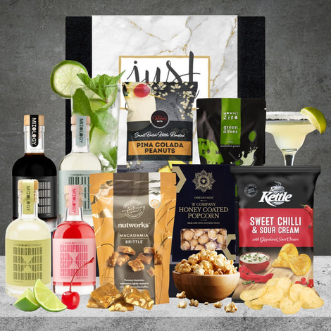Send some enjoyment to someone special with this Cocktail Hamper. With a selection of snacks and 4 cocktail blends, your loved ones are bound to have a joyful celebration. They'll be singing from the joy of indulging in the coffee lover's Espresso Martini, a citrusy Margarita, a lip-smacking sweet and sour Cosmopolitan and a bubbly rum Mojito cocktail with a minty-fresh, citrusy and sweet drink. Oh, what fun!