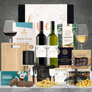 This Wedding hamper is one amazing gift they'll love. With a bottle of red and white wine, a cheeseboard and knife set, delicious Australian eats and indulgent treats, it's the perfect gift for the loving couple as they celebrate their nuptials.