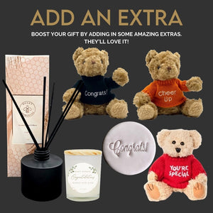 Make your gift unique by adding a little something extra special. Add a special personalised candle, a sneaky bottle of wine, an extra sweet box of chocolates... There are lots of choices available to make your gift one to be remembered!