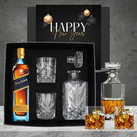 A deluxe whisky and decanter New Year gift set, presented in a stunning gift box. This wonderful gift hamper with the Master of Whiskies, Johnnie Walker Blue Label makes an exquisite New Year gift or a perfect Year end thank you gift for the whisky lover.