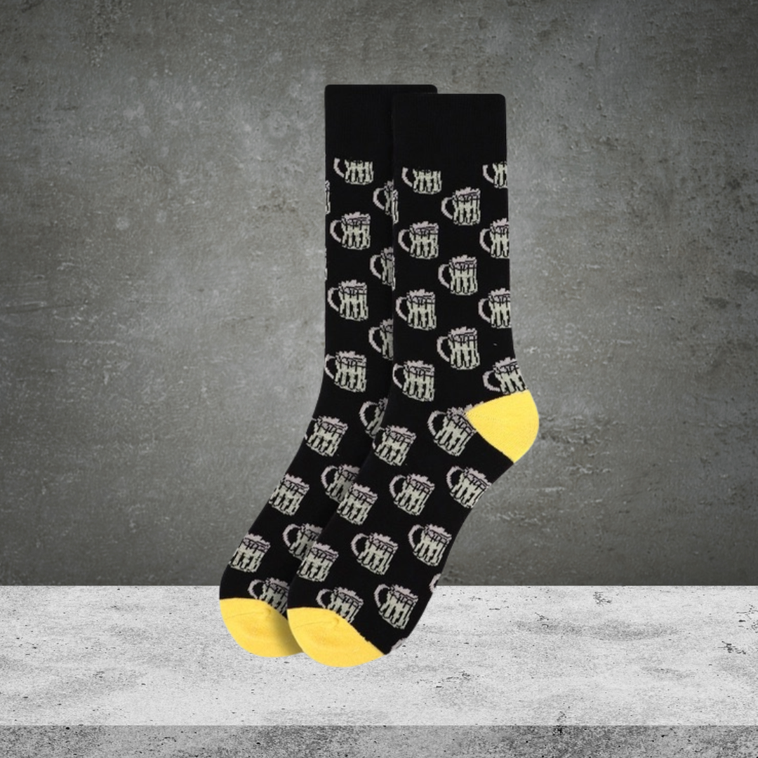 Fun novelty socks featuring a cheerful beer mug design for men.